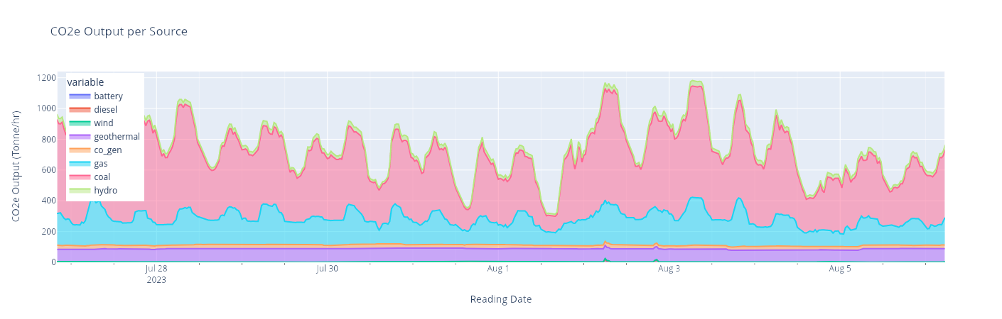 The amount of extra CO2e emitted by the grid if you turned on an appliance, in gCO2e/kwh. Heavily influenced by sources of power and the operational status of power-plants, meaning it has much longer cycles than the Cumulative Output.